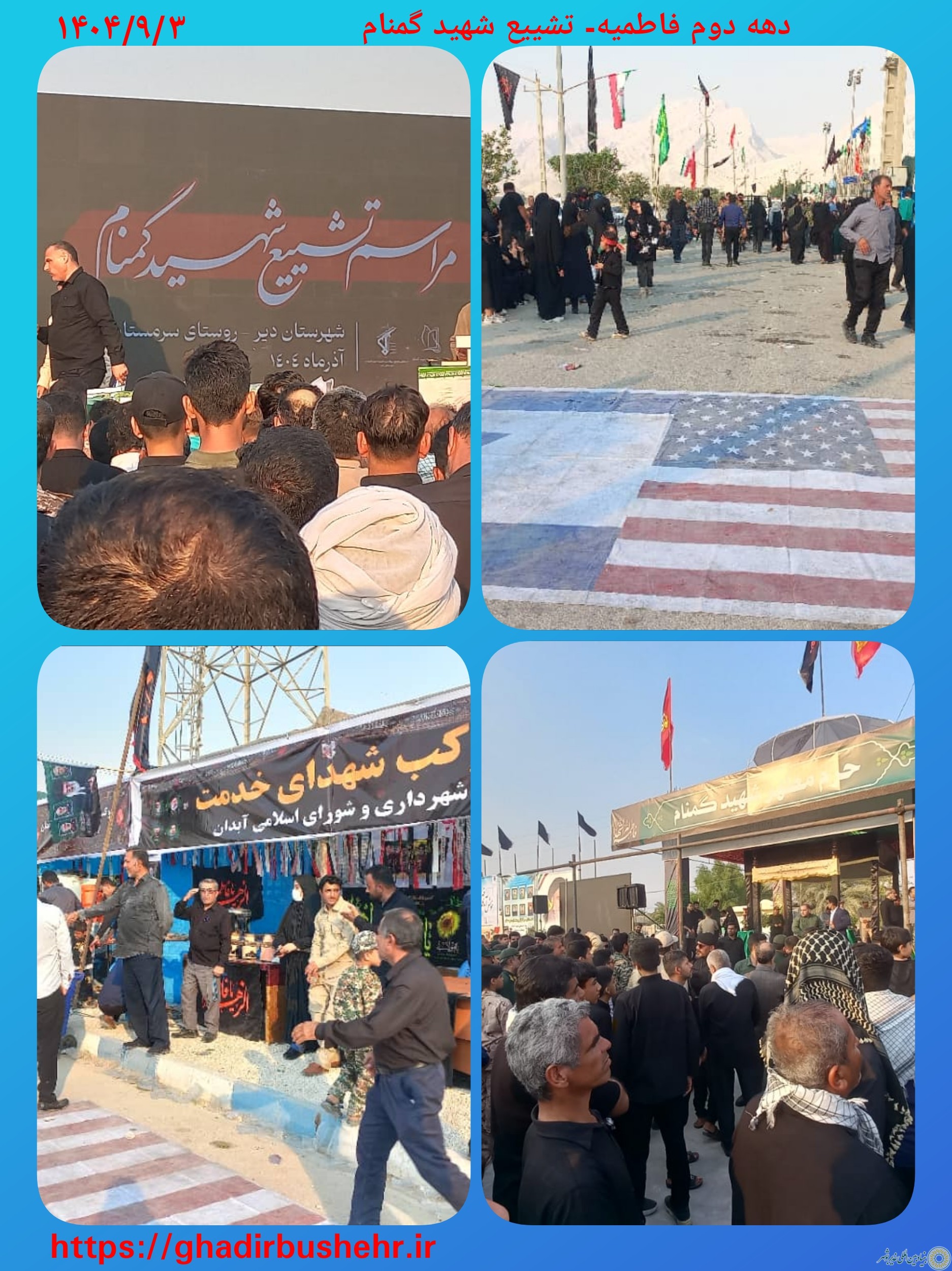 🏴مقارن با دهه دوم فاطمیه ، مردم ولایتمدار و مسئولان شهرستان دیر و بخش آبدان و روستاهای مجاور بالاخص سرمستان با شکوه خاصی مراسم عزاداری حضرت فاطمه”س” و تشییع پیکر مطهر شهید گمنام را بر دستان شان میزبانی و خاکسپاری نمودند.