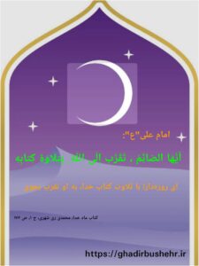 اى روزهدار! در شب و روزت با تلاوت كتاب خدا، به او تقرّب بجوى، كه همانا كتاب خدا، شفیعى است كه روز قیامت، شفاعتش براى قرآنخوانان پذیرفته است و با خواندن آیات آن، از درجههاى بهشت بالا میروند.