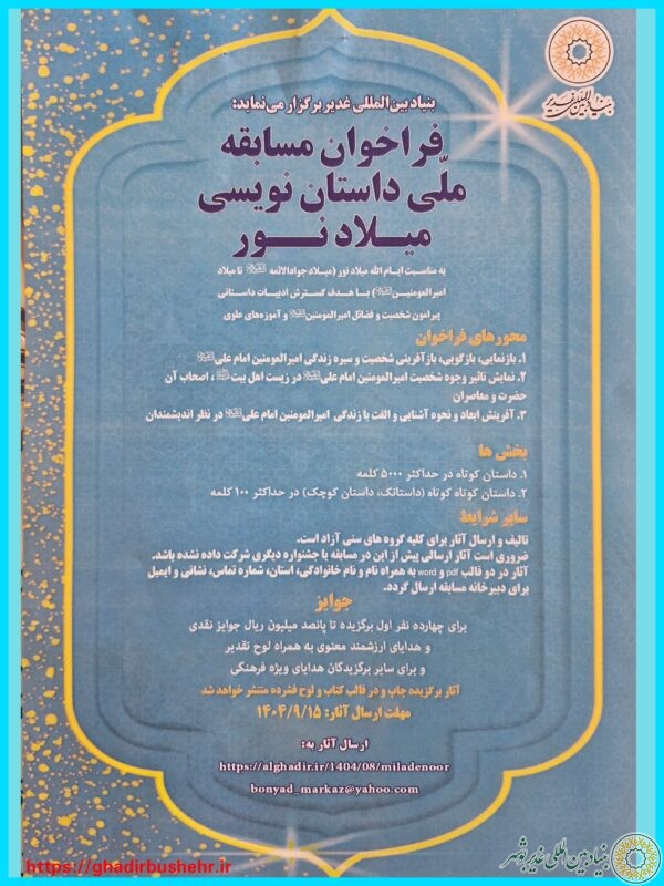 09 آذر اخبار شهرستان ها, بوشهر, فراخوان ها, کتابخانه, گالری تصاویر فراخوان ملی؛ مسابقه داستان نویسی میلاد نور 09/09/1404 توسط یزاف 0 نظرات 🗓 یکشنبه ۱۴۰۴/۹/۹ ✒️گزارش معاونت علمی و پژوهشی بنیاد بین المللی غدیر استان بوشهر 📜 فراخوان ملی؛ مسابقه داستان نویسی میلاد...ادامه مطلب
